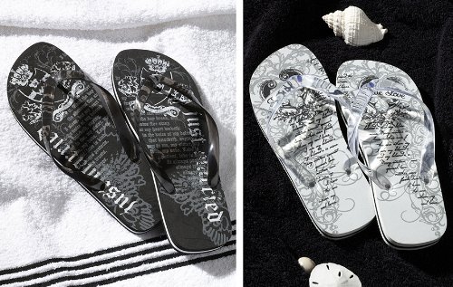 Take a stroll along the beach wearing a pair of these stylish honeymoon flip-flops (Womens Size 5-6). The flip-flop bottoms are designed so the words "JUST MARRIED" are printed out in the sand with your footsteps. Each is made of foam rubber with plastic straps. Both flip-flops are white with black and gray design that says "Just Married." Also available in Womens Size 9-10, Womens Size 7-8, Mens Size 12, Mens Size 11 and Mens Size 10.You will not be disappointed with