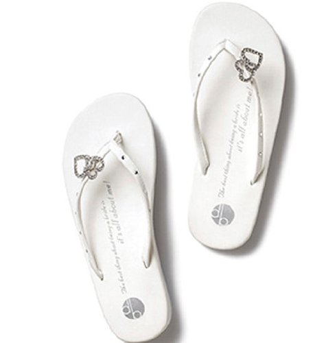 This is an in stock item and will be sold as-is. No returns or exchanges allowed.These soft wedding flip flops are fabulous! The white bridal sandal is adorned with a sparkling crystal double heart charm and the sole is printed with the phrase:"The best thing about being a bride is - It's All About Me!"DB Flip Flops by Girl Two Doors Down are all the rage! Desperate Housewives actress Marcia Cross gave these as gifts to her bridesmaids. Loved by tons more celebrities such as Jennifer Aniston, Eva Longoria, Denise Richards, Paris Hilton, Britney Spears, Nicolette Sheridan, Jessica Alba, Cameron Diaz, Kelly Ripa, Rachel Bilson and Mischa Barton. Featured in top style magazines coast to coast, such as In Style and People. Get your DB flip flops by Girl Two Doors Down now and join in the fun!Down Boy! I'm not the girl next door...I'm the girl two doors down!Available in sizes small through extra large. Sizes extra small (5 - 6.5) measures 9 inches, small (size 7) measures 9 1/2 inches, medium (size 8 - 8.5) measures 10 inches, large (size 9 - 9.5) measures 10 1/2 inches, and extra large (size 10 - 10 1/2) measures 11 inches.You will not be disappointed with