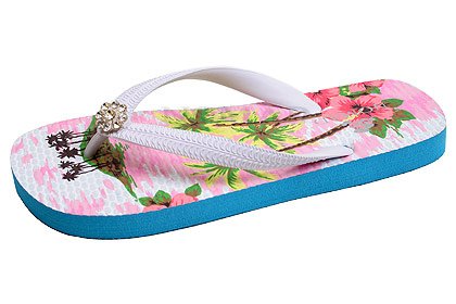 Aloha! Travel to Hawaii without leaving town. These Hawaiian print inspired flip-flops are just what you need on those HOT summer days. The upper and bottom have a contrasting color and the upper is centered with a matching rhinestone flower. The Hawaiian print foot sock is made with a soft and flexible rubber, which will make you feel like you are walking on the sands of Waikiki. Material: Strap - Rubber Bottom - RubberYou will not be disappointed with